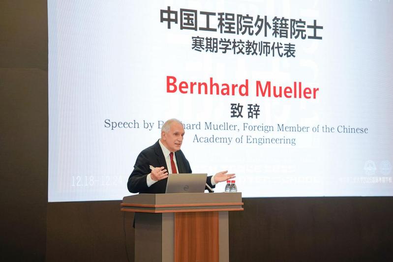 随后,中国工程院外籍院士、德国国家科学与工程院院士、德累斯顿工业大学Bernhard Mueller发表致辞,结合自身长期的跨国教学与科研经验,从国际建筑教育与寒地研究的视角分享了深刻见解。Mueller教授特别寄语在场的青年学子,鼓励大家以开放的视野拥抱多学科交叉与国际合作,在真实复杂的环境问题中锤炼学术判断力与社会责任感。