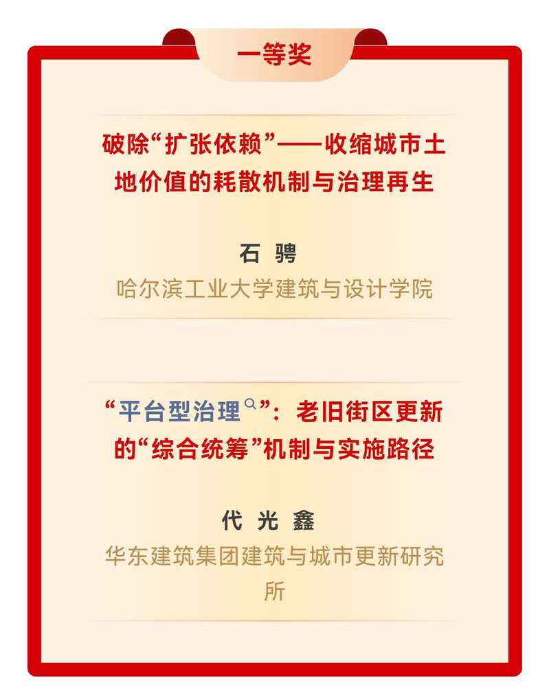 本届竞赛以“创新发展与包容城市”为主题,共收到来自全国26个省(区、市)及海外地区高校、科研院所与设计单位的169篇论文投稿。主办单位邀请规划领域的权威专家组成了论文评审团队,采取匿名评审方式,经初审、复审和评议三个评审阶段的严格审查,最终确定一等奖2篇、二等奖4篇、三等奖9篇、佳作奖15篇。我院本次获奖论文直面当前城市发展中的现实挑战,聚焦于“收缩城市”这一前沿议题,在新马克思主义政治经济学视角下,创新性地探讨了土地价值在收缩过程中的耗散机制,并提出了具有理论深度和实践价值的治理再生策略,为相关领域研究开辟了新的问题域。